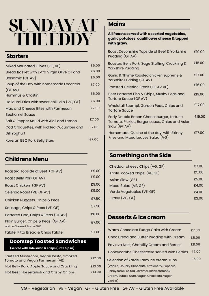 Anything marked with a (GF AV) can be made gluten free. (VE) is vegan friendly. (VG) is vegetarian. For specific dietary requirements or any other requirements please reach out to us at –